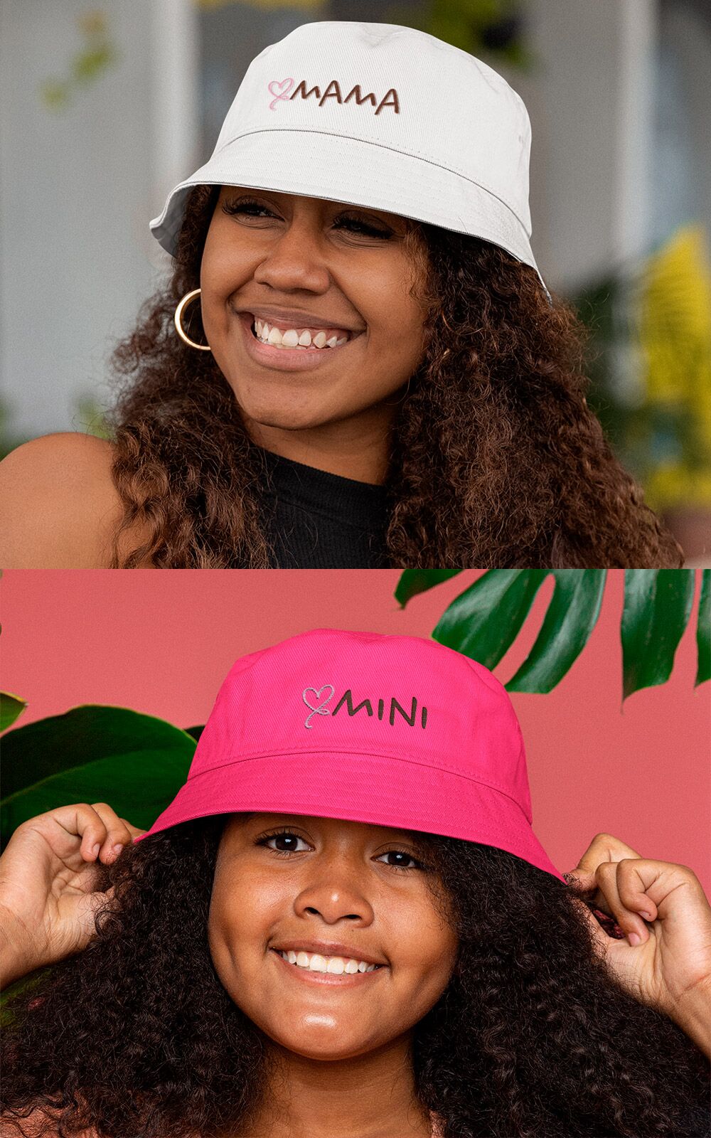 A matching embroidery set with a difference - "Mama" and "Mini" in a genuine handwritten style, stitched directly onto the garment. The handwritten quality gives it a warmth that a standard font just doesn't have. Personal, considered, and the kind of detail that makes people look twice. Available embroidered on caps and bucket hats for Mum and the mini.